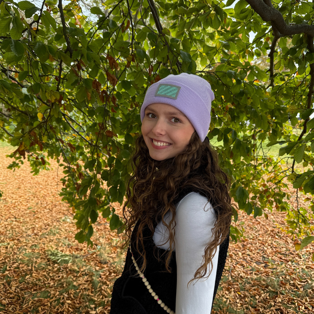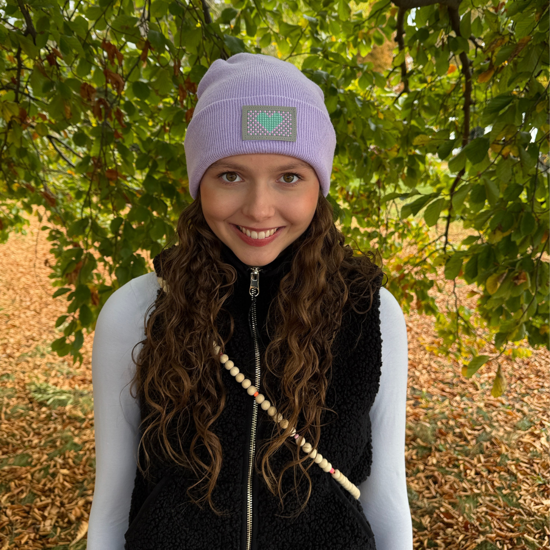 Frisch & verspielt: Lavender Beanie mit Spring-Buzz-Labels – perfekt für leichte Looks.