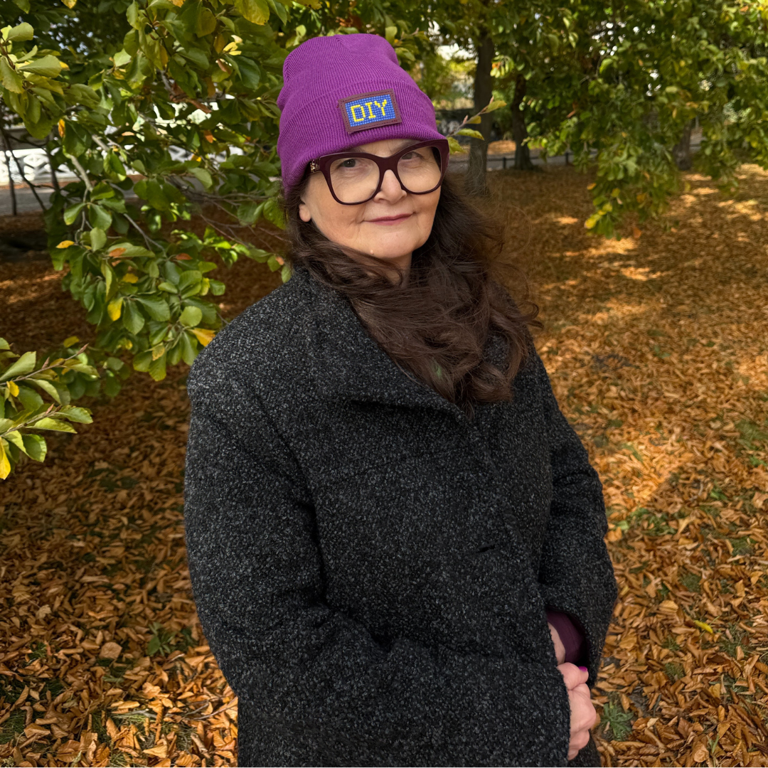 Klar & kräftig: Purple Beanie mit Retro-Pop-Labels für einen starken, modernen Look.