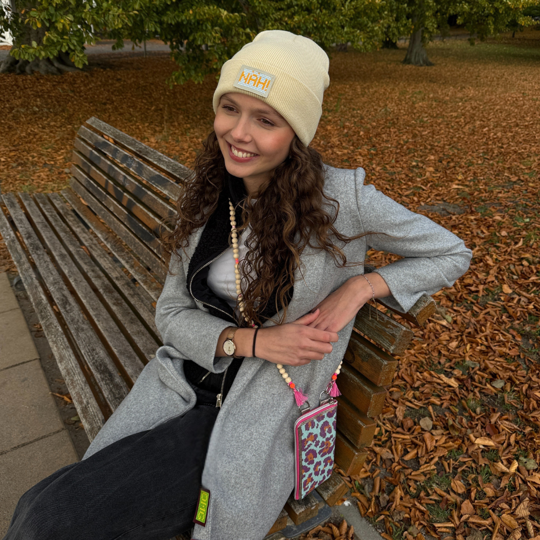 Warm & soft: Sandfarbene Beanie plus Candy-Talk-Labels für sanfte Statements.