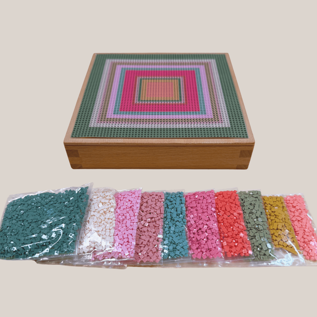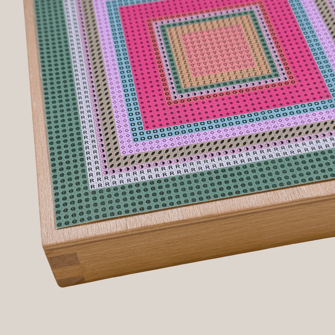 Dein Mini Metrics Duo wird sorgfältig für dich vorbereitet. Die Vorlage wird vorab präzise auf einen hochwertigen Buchenholzkörper aufgebracht, sodass du nach Erhalt direkt mit dem Setzen der Steinchen starten kannst.