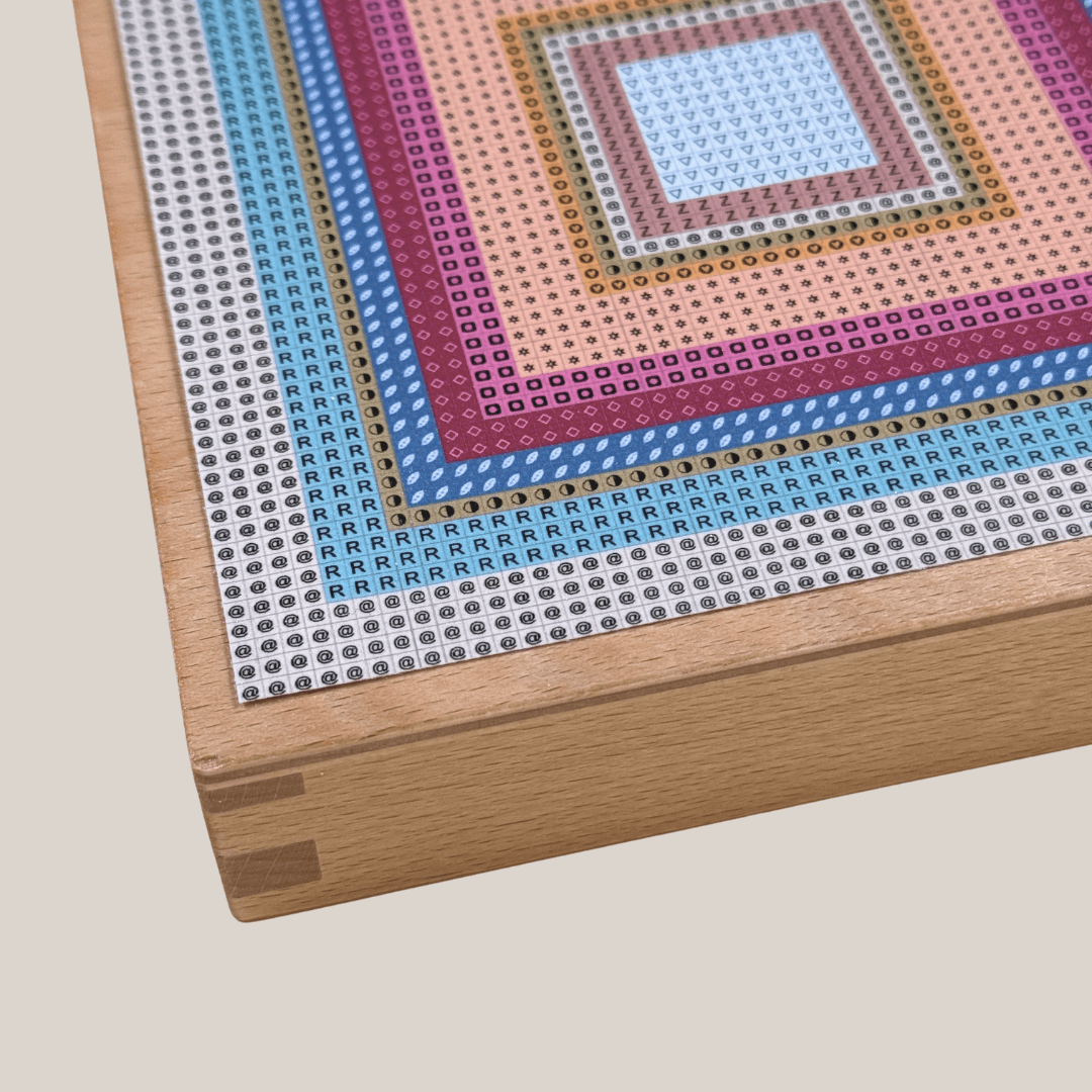 Dein Mini Metrics Duo wird sorgfältig für dich vorbereitet. Die Vorlage wird vorab präzise auf einen hochwertigen Buchenholzkörper aufgebracht, sodass du nach Erhalt direkt mit dem Setzen der Steinchen starten kannst.