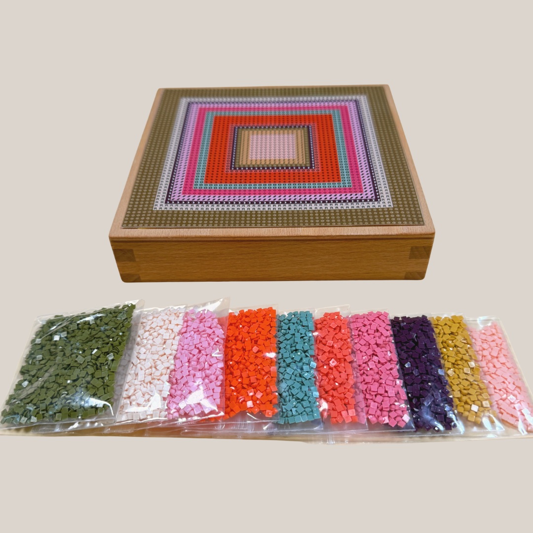 Dein Mini Metrics Duo wird sorgfältig für dich vorbereitet. Die Vorlage wird vorab präzise auf einen hochwertigen Buchenholzkörper aufgebracht, sodass du nach Erhalt direkt mit dem Setzen der Steinchen starten kannst.