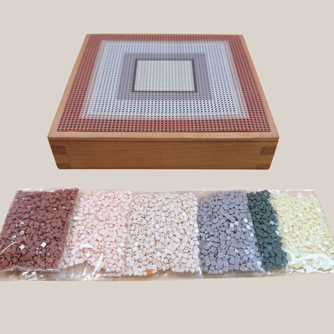 Dein Micromosaic-Kit wird sorgfältig für dich vorbereitet. Die Vorlage wird vorab präzise auf einen hochwertigen Buchenholzkörper aufgebracht, sodass du nach Erhalt direkt mit dem Setzen der Steinchen starten kannst.