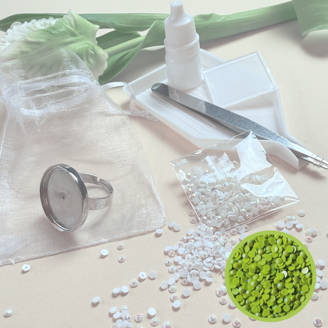 Dieses Schmuck-Set ist wie gemacht für deinen Start in die Micromosaic-Welt: Die runde Ringfläche bringt die Farbe deiner AB-Steinchen perfekt zur Geltung und bietet die Bühne für ein ausdrucksstarkes, einfarbiges Design.