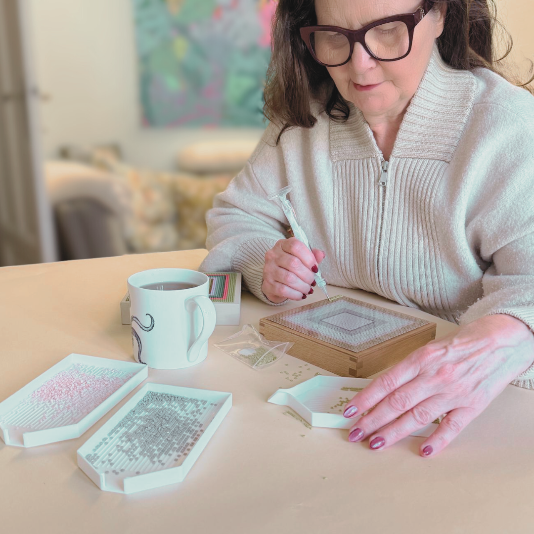 Du ziehst die Schutzfolie ab, setzt die Steinchen – und hast am Ende ein fertiges Mini-Wandbild.