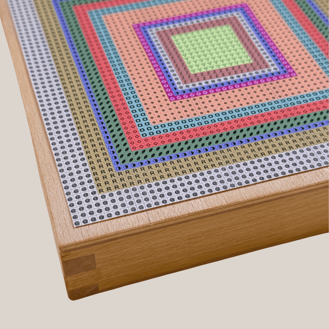 Dein Mini Metrics Duo wird sorgfältig für dich vorbereitet. Die Vorlage wird vorab präzise auf einen hochwertigen Buchenholzkörper aufgebracht, sodass du nach Erhalt direkt mit dem Setzen der Steinchen starten kannst.
